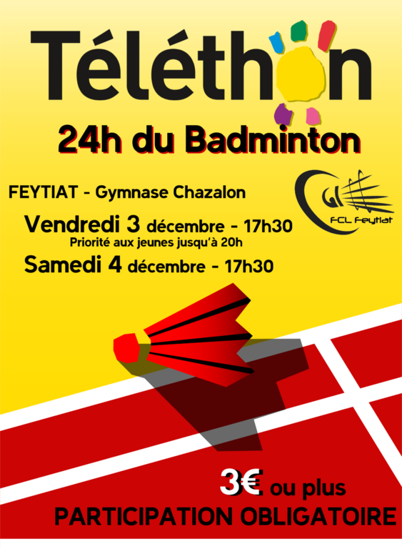 Depuis plusieurs années (malgré une petite pause COVID), notre club participe au Téléthon avec ses 24h de bad!